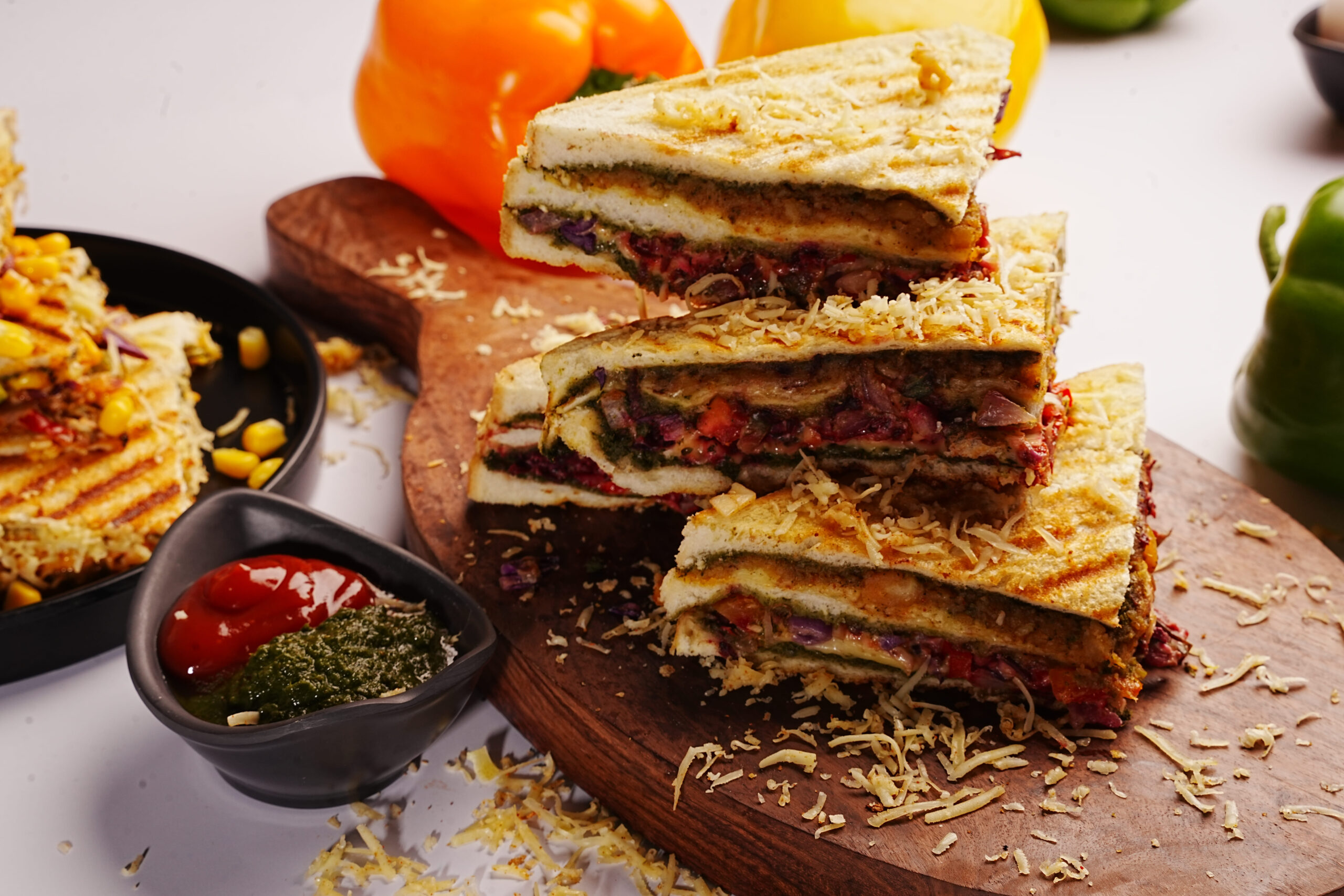 Double layered sandwich filled with exotic veggies and pizza flavors.