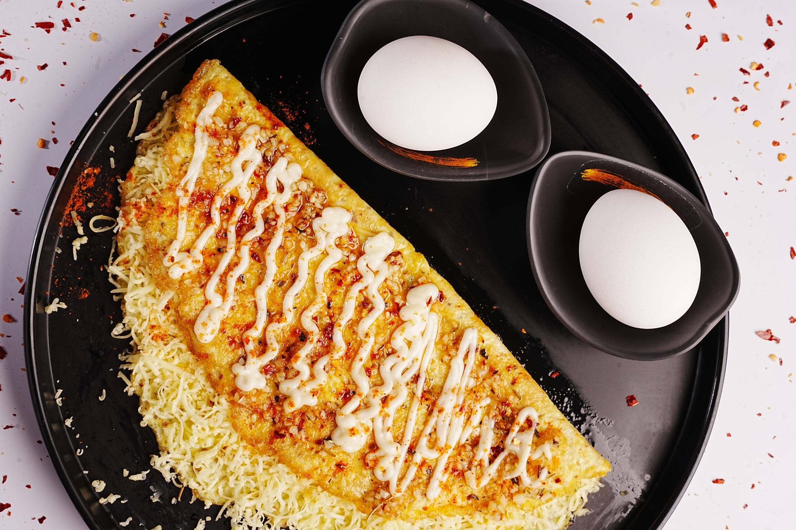 Light and fluffy scrambled egg topped with cheesy Szechwan sauce, sev, and a special spice mix.