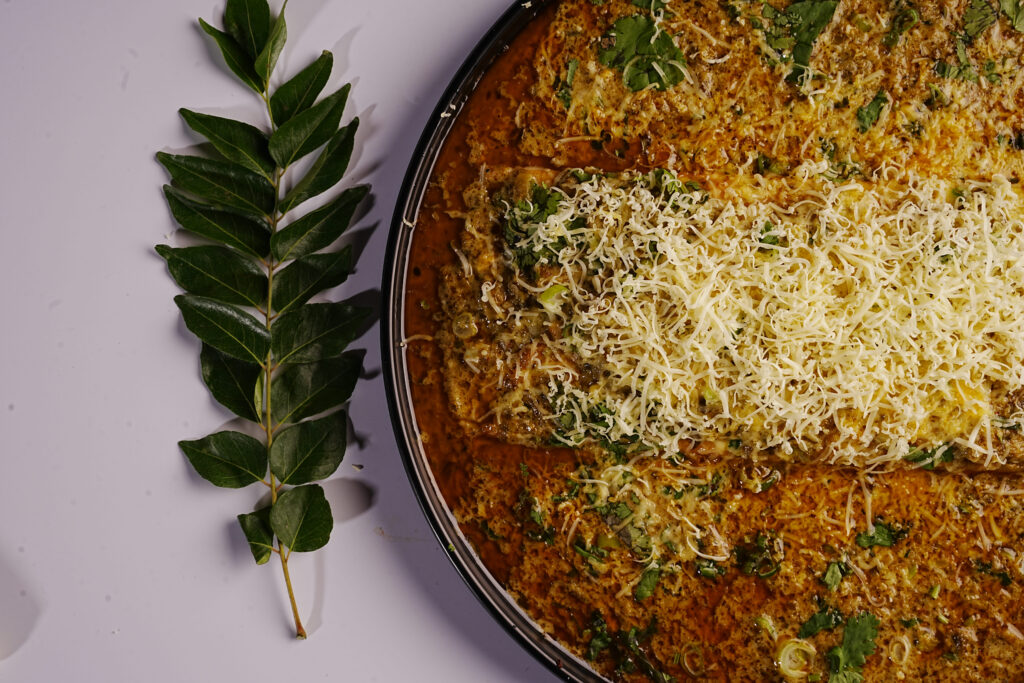 Omelet stuffed with mixed cheese, layered with creamy green gravy and finished with a smoky garlic tadka.